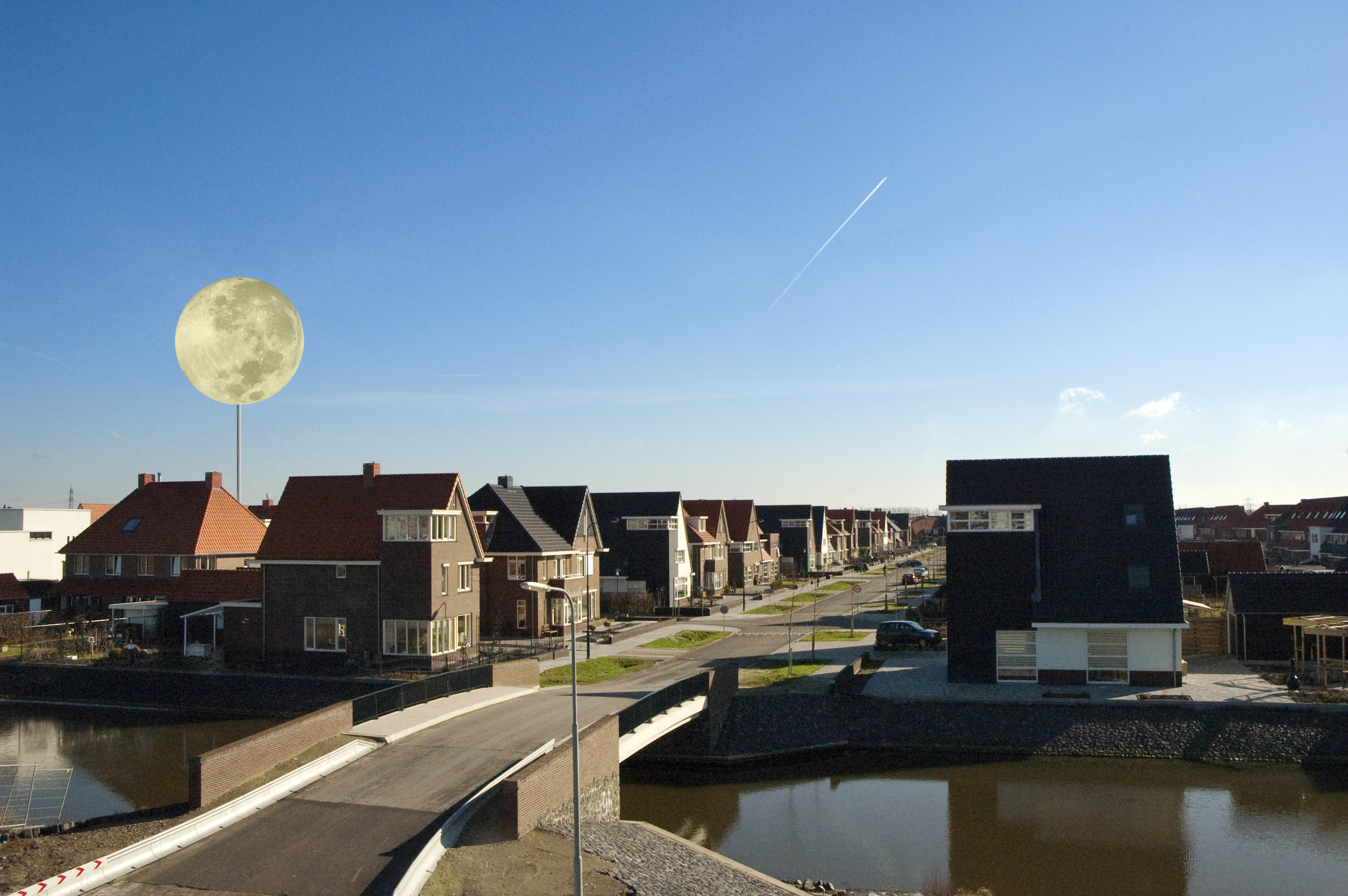 Het is mij duidelijk geworden dat de bewoners en toekomstige bewoners van de Mortiere erg blij zijn met hun wijk. Men is vooral erg tevreden met het historische uiterlijk van de wijk. Boven zo'n wijk zou eigenlijk permanent een volle maan moeten hangen. Als verbeelding van het verlangen, van de illusie. Een eigen volle maan voor deze wijk. Het is daarom dat ik voorstelde een volle maan te plaatsen, op een strategische plaats in de wijk, omhoog gehouden door een mast.